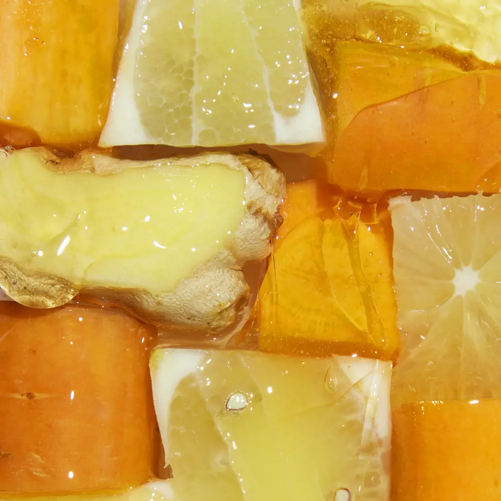 - این محصول که با دقت ساخته شده است، دارای ۹۷٪ مواد اولیه طبیعی با ترکیبی از روغن دانه لیمو بازیافتی از صنایع غذایی، به همراه عصارههای خالص هویج و زنجبیل ارگانیک است .