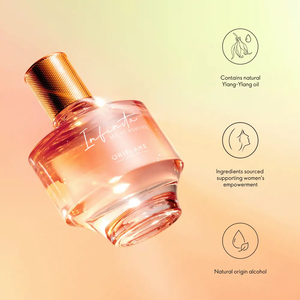 با عطر Infinita My Sunshine Eau de Parfum در فضایی آفتابی زندگی کنید - رایحهای زنانه و درخشان با رایحه گلهای خورشیدی برای کشف فصل جدید و درخشانی از زنانگی.